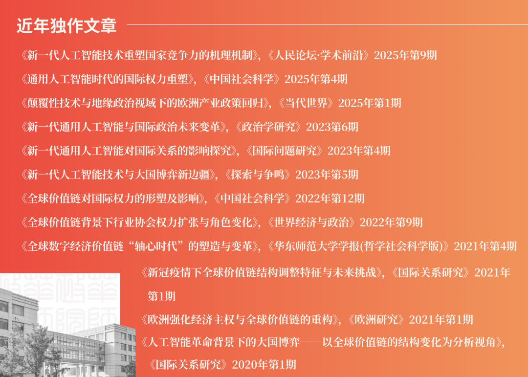 主要研究领域为国际政治经济学、全球价值链、新技术革命与国际关系变迁